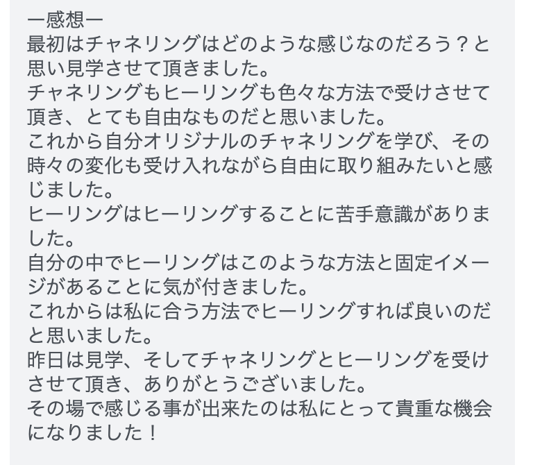 こちらのご感想をくださった方は、ヒーリングに苦手意識があって、練習会に参加していなかったそうなんです。でも今回、見学に来てくださって。そうしたら、ヒーリングやチャネリングに対する固定概念が崩れて、「もっと自由でいいんだ」と気づいたそうです。