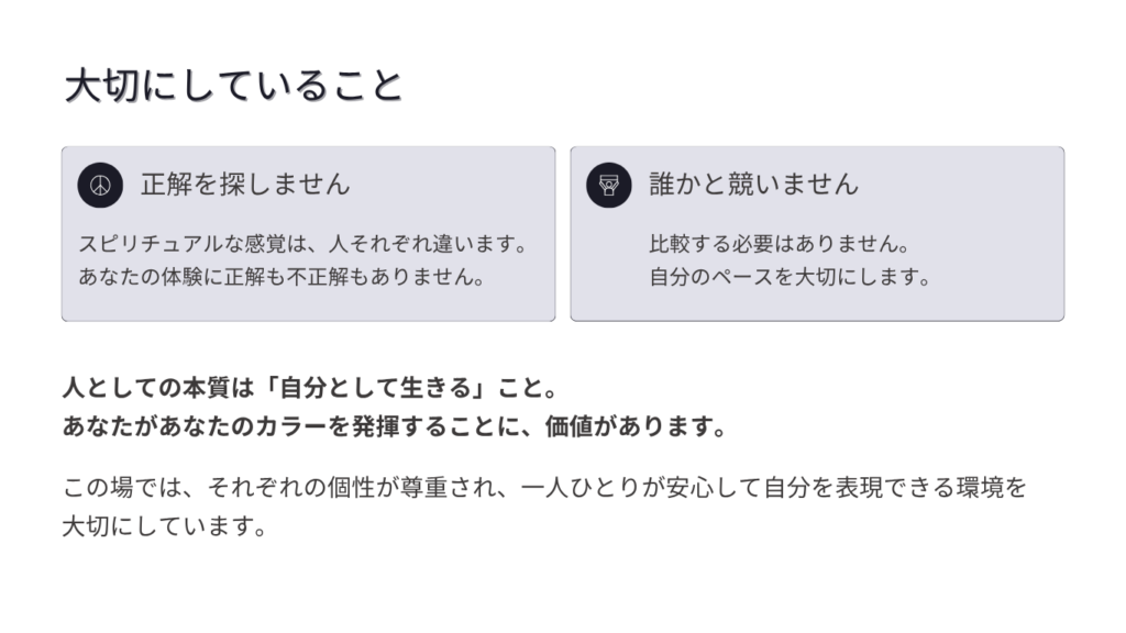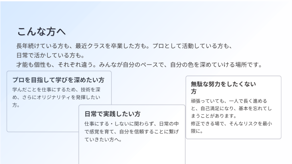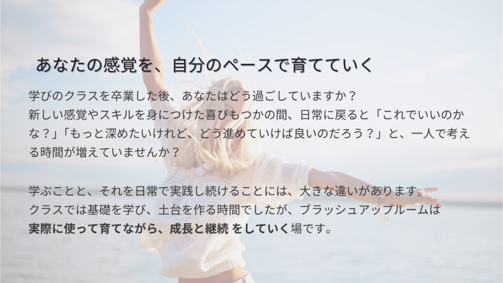 学びの場にいる間は自然と磨かれていたものが、日常に戻ると「これで合っているのかな」「もっと深めたいけど、どう進めればいいのか」と一人で抱えてしまうことがあります。そして使わなければ宝の持ち腐れとなります。これは、あなたの努力が足りないのではなく、続けるための環境が整っていなかったからではないでしょうか?