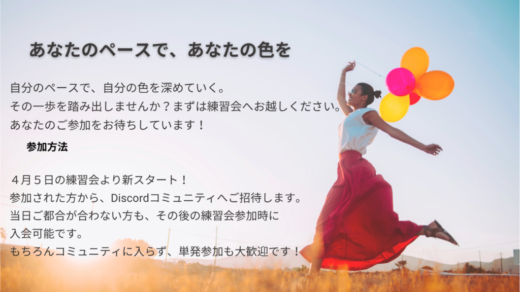 あなたのペースで、あなたの色を深めていく。練習会での気づきをDiscordで日常につなげながら、学びを実践へと育てていきませんか?
